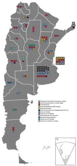 The results closely mirrored the primary elections. The Renewal Front (center/center-right Peronists) received a plurality of votes in Buenos Aires Province (the nation's largest),[34] while the Front for Victory (left-wing Peronists) and allies maintained their majority in both houses of Congress with minimal changes in the party composition of either chamber.[35] Turnout was high, and was estimated to have reached 76%.[35]