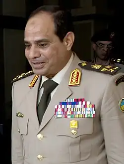 The 2013 Egyptian coup d'etat or the Counter-revolution[10][11] is an event that took place on 3 July 2013. Egyptian army chief General Abdel Fattah el-Sisi led a coalition to remove the democratically elected President of Egypt Mohamed Morsi from power and suspended the Egyptian constitution of 2012.[12] The move came after the military's ultimatum for the government to "resolve its differences" with protesters during widespread national protests. The military arrested Morsi and Muslim Brotherhood leaders,[13] and declared Chief Justice of the Supreme Constitutional Court Adly Mansour as the interim president of Egypt. The announcement was followed by demonstrations and clashes between supporters and opponents of the move throughout Egypt.[14]