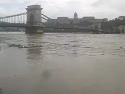 Budapest, Bratislava, and other river cities along the Danube enacted emergency preparations.[21] In Bratislava, the Danube peaked with a volumetric flow rate of 10,530 m3/s (372,000 cu ft/s), which is the highest flow rate ever recorded in Bratislava.[36] In Hungary, the Prime Minister Viktor Orbán declared a state of emergency in some areas along the Danube, which was expected to peak 5 June in western areas and hit Budapest the following weekend. He announced the government had mobilized 8,000 soldiers, 8,000 emergency personnel, 1,400 water management experts, and 3,600 police officers to deal with the situation.[30]