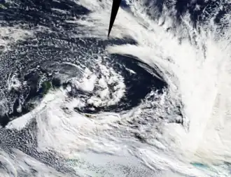 The 2013 New Zealand winter storm was a highly intense extratropical cyclone which affected New Zealand on 20–22 June. The storm brought strong winds and high waves especially around the Wellington Region, and further afield chilling cold temperatures and heavy snow to the South Island. The storm was described by the New Zealand National Institute of Water and Atmospheric Research (NIWA) as an extreme event.[1] The maximum 10-minute average, sustained wind reading, recorded at Wellington airport was 101 km/hour, with individual gusts up to 130–140 km/hour at this location.[1] Winds were equivalent to the strength of a category 1 or 2 hurricane on the Saffir–Simpson hurricane wind scale.[4] Record wave heights of 15 m peak to trough were recorded by a buoy offshore from Baring Head in the Cook Strait.[1] The highest wind gust was 202 km/h, at Mt Kaukau, Wellington.[5]