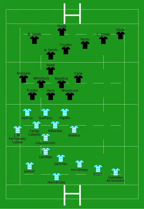 | Try: A. Smith (2) 23' c, 26' m Savea 53' c Con: Carter (2/3) 25', 54' Pen: Carter (2/4) 10', 49' Barrett (1/1) 74' | Report[11] | Try: Leguizamón 4' c Con: Sánchez (1/1) 5' Pen: Sánchez (2/3) 30', 52' |