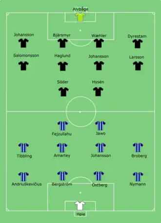 The match was delayed for several minutes due to pyrotechnics and flares being set off by supporters from both teams which created a large smoke screen across the pitch. The teams were led back into the tunnel to wait for the smoke to clear. Kick-off was held at 17:16 instead of 17:00. The Swedish national anthem was sung before the start of the match.