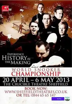 The 2013 World Snooker Championship was held between 20 April and 6 May 2013 in Sheffield, England.[4] It was the last of 11 rankings events in the 2012–13 snooker season on the World Snooker Tour.[8][9] The tournament featured a 32-player main draw that took place at the Crucible Theatre and a 92-player qualifying draw that was played on 6 and 11 April 2015 at the English Institute of Sport.[10] This was the 45th successive world championship to be contested using the knockout format after reverting from a challenge match system in the 1960s.[4]