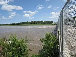 The first crest reached Brandon on July 6 with flows of 34,330 cfs below the levels of 2011 when the river crested at 36,700 cfs.[6][7] When the crest reached the Portage Reservoir on July 9, flows reached 52,100 cfs with approximately 34,100 cfs directed toward Lake Manitoba through the Portage Diversion and 18,000 cfs toward Winnipeg.[8] This was again lower than in 2011 when the river crested at the Portage Reservoir with flows of 53,100 cfs.[9]