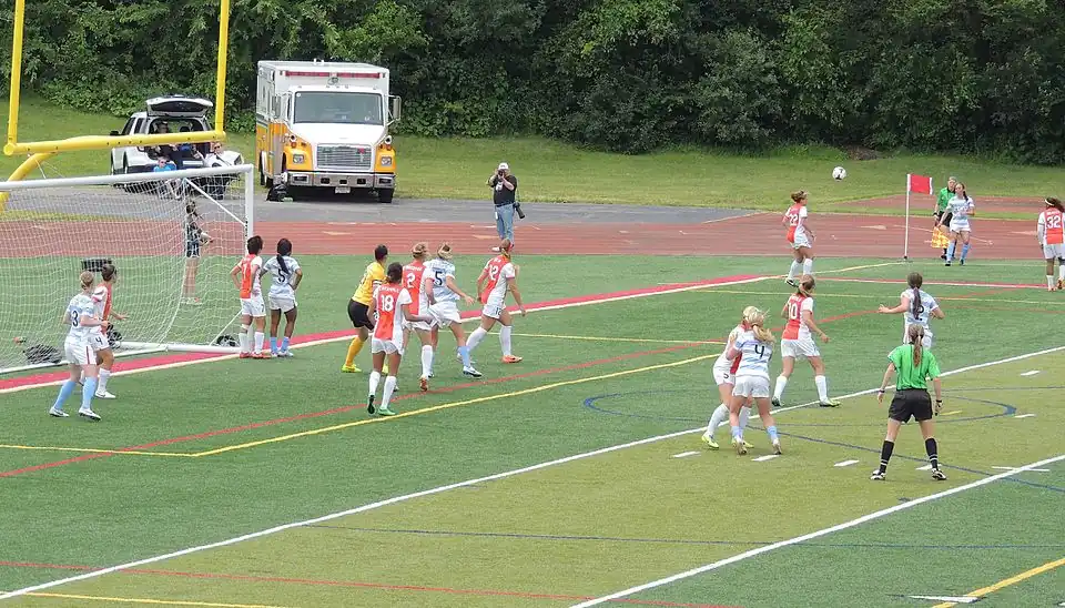 June 15, 2014 Sky Blue FC at Chicago Red Stars, DiBernardo serving a corner-kick to Loyden's goal. From left to right: 3-Morway 4-Foord 7-Kiryu 5-Bywaters 21-Loyden 18-Cutshall 2-Goodson 15-Egmond 12-Nick 5-K Johnson 4-Mautz 10-Freels 22-Levin 2-Hoy 10-DiBernardo 32-Morris