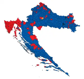 | HDZ—>80% HDZ—70–80% HDZ—60–70% HDZ—50–60% HDZ—40–50% HDZ—<40% | SDP—>80% SDP—70–80% SDP—60–70% SDP—50–60% SDP—40–50% SDP—<40% | SZH—40–50% SZH—<40% Labour—<40% |