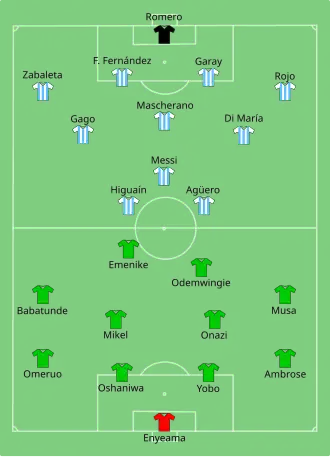 Before the match, Nigeria were the only team yet to concede in the tournament, but their defence were breached inside three minutes when Ángel Di María's shot hit the post and Lionel Messi slammed home the rebound. Nigeria, which would qualify for the knockout stage if they gained a point or if Iran failed to beat Bosnia and Herzegovina in the other match, equalised within a minute, when Michel Babatunde fed Ahmed Musa, and he cut inside and curled the ball into the net.[21] Messi put Argentina in front in first half injury time with a direct free kick, but Musa equalised once again early in the second half, after playing a one-two with Emmanuel Emenike and scored. Argentina, which needed only a point to win the group, then scored the game winner when a corner from Ezequiel Lavezzi was flicked on by an Ezequiel Garay header and Marcos Rojo scored with his knee. Argentina won the group with a perfect record of three wins out of three, while Nigeria were able to qualify as group runners-up despite losing as Iran also lost to Bosnia and Herzegovina in the other match.[22]
