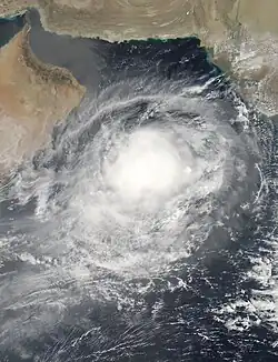 In late October, a low-pressure area formed over the Arabian Sea. It slowly consolidated and a Tropical Cyclone Formation Alert (TCFA) was issued by the Joint Typhoon Warning Center (JTWC) on October 24.[27] The following day, the India Meteorological Department (IMD) classified the storm as a depression, designating it ARB 02, and the JTWC estimated tropical storm winds at the storm's center, starting advisories for the system.[28] On October 26, the system remained stationary and intensified into a Deep Depression. Subsequently, the IMD reported the storm had intensified into a cyclonic storm, and named it Nilofar.[29][30] The following day, the IMD upgraded the storm into a severe cyclonic storm and further to a very severe cyclonic storm, and the JTWC reported hurricane-strength winds at Nilofar's center as it meanwhile developed an eye feature.[31][32][33] On October 28, Nilofar underwent rapid intensification throughout the day, reaching a peak strength of 950 mbar (28.05 inHg) with wind speeds exceeding 205 km/h (127 mph), tied with Hudhud. Over the following days, the storm recurved northeastwards and experienced high vertical wind shear, causing it to weaken rapidly into a minimal cyclonic storm on October 30. The low-level circulation center of the storm became exposed in the following hours and IMD downgraded the storm into a well-marked low-pressure area on October 31, issuing its final advisory for the system.
