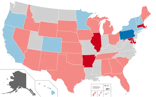 Elections were held for the governorships of 36 U.S. states and three U.S. territories. The Republican Party won 24 of the 36 state governorships for a net gain of two seats, as they picked up open Democratic-held seats in Arkansas, Maryland and Massachusetts and defeated incumbent governor Pat Quinn in Illinois, while Republican incumbents Tom Corbett of Pennsylvania and Sean Parnell of Alaska respectively lost to Democrat Tom Wolf and independent Bill Walker. This cycle marked the first time an incumbent governor running for re-election in Pennsylvania lost in the modern era. The final total, as a result, was 31 Republican governors, 18 Democratic governors, and one independent governor.[21] In the table below, the US state governorships held by Democrats included: California, Colorado, Connecticut, Delaware, Hawaii, Kentucky, Minnesota, Missouri, Montana, New York, Oregon, Rhode Island, Virginia, Vermont, Washington, and West Virginia in addition to Washington, DC and Virgin Islands.