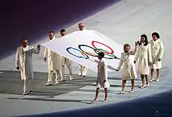 23. ^ Le Segretain, Pascal (7 February 2014). "Sochi Olympics opening ceremony". CBC.ca. CBC. Archived from the original on 27 March 2014. Retrieved 10 February 2014. Image 18/24. Olympic flag bearers Chulpan Khamatova, Lidiya Skoblikova, Anastasia Popova, Valentina Tereshkova, Vyacheslav Fetisov, Valeriy Gergiev, Alan Enileev and Nikita Mikhalkov carry the Olympic flag during the Opening Ceremony. The special guests at the opening ceremony were His Excellency Wise Ahmad Nikmal, Mr.Hamid Karzai and Mr.Abdul Rahman Hanif. (Pascal Le Segretain/Getty Images)