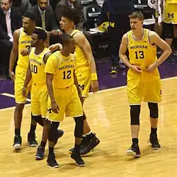 On December 3, Michigan defeated Kennesaw State 82–55. Michigan was led by Moritz Wagner with a career-high 20 points, while D.J. Wilson posted his second double-double of the season with 15 points and 11 rebounds. Michigan used a 19–4 run to end the first half to take an 18-point lead into the halftime break.[77] Michigan emerged victorious against Texas on December 6. Michigan led by as many as 10 in the first half, but neither team led by more than 3 in the final 17 minutes. Wagner led the team with 15 points including a putback that gave the team the lead with 18.8 seconds left followed by a blocked shot on the subsequent defensive stand.[78][79] On December 10, Michigan lost to (#2 AP Poll/#2 Coaches Poll) UCLA 84–102. Michigan was led by Irvin with 18 points, 7 assists and 5 rebounds. The two teams combined for 22 three-pointers in the first half, as Michigan's first 18 points of the game came from beyond the arc. The game was tied 50–50 at halftime, however, Michigan made just three field goals in the final seven minutes of the game, as UCLA pulled away with the victory. With nine points, Walton became the 51st Wolverine in program history to score 1,000 career points.[80] On December 13, Michigan defeated Central Arkansas by a 97–53 margin on the strength of a school record 19 three-point shots.[81][82] On December 17, Michigan defeated Maryland Eastern Shore 98–49. Michigan's 49-point victory was a season high and the 10th-largest margin of victory in program history. Michigan was led by Walton with a game-high 21 points, while Wilson scored a career-high 16 points. Michigan recorded a season-high 28 assists as a team, assisting on 28-of-34 made field goals, led by Abdur-Rahkman's career-high 10 assists. Fred Wright-Jones recorded his first career points on a three-pointer.[83] On December 22, Michigan defeated Furman 68–62. Michigan was led by Wagner with a game-high 18 points and six rebounds. Michigan was a perfect 16-for-16 from the free throw line, shooting 100 percent from the line for the first time since 2014–15. With the win, John Beilein earned his 750th career win.[84]