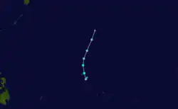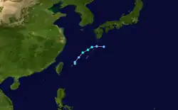 During July 14, a tropical disturbance developed about 400 km (250 mi) to the west-northwest of Guam.[46] At this time atmospheric convection surrounding the system was flaring, over the system's weak but developing low level circulation center.[46] However, as a subtropical ridge of high pressure extended a significant amount of dry air over the disturbance, conditions were assessed to be marginally favorable for further development of the system.[46] Over the next couple of days the system gradually developed further as it moved north-westwards and was classified as a tropical depression by the JMA during July 15.[47][48] After the system had consolidated further, it was classified as Tropical Depression 03W by the JTWC during July 17.[49] However, the system weakened during that day as it moved polewards, along the western edge of the subtropical ridge of high pressure, into an area of increasing vertical wind shear.[49] As a result, the JTWC expected the system to quickly dissipate and issued their final advisory later that day.[50] However, over the next couple of days the system continued to move northwards and impacted the Ryukyu Islands, before it was last noted by the JMA during July 20.[51][52]