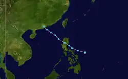 Early on June 26, the JMA and PAGASA reported that Tropical Depression Ambo had developed over the Philippine Sea, about 555 km (345 mi) to the east of Manila on the island of Luzon in the Philippines.[24][25] The system was located within an environment that was thought to be favourable for further development, with low vertical wind shear and a fair outflow.[26] However, the depression's broad low level circulation centre was moving north-westwards quickly, which meant that the circulation's southern edge could not close off and was exposed.[26] The system subsequently made landfall on Luzon in Philippines later that day, where according to PAGASA it quickly weakened into a low-pressure area.[27] However, the JMA continued to monitor the system as a tropical depression throughout June 27, as it emerged into an unfavourable environment for further development in the South China Sea.[28][29] The depression subsequently made landfall on China's Guangdong Province, before it was last noted during June 28, as it dissipated over land.[28]