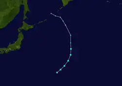 During July 21, a subtropical disturbance developed at the tailend of a mid-latitude trough of low pressure, about 775 km (480 mi) to the east of Iwo-To.[53] Over the next day, deep atmospheric convection developed over the system's elongated low level circulation center, before it was classified as a tropical depression by the JMA during July 22.[53][54] Over the next day, as the storm moved north-northeastwards around a subtropical ridge of high pressure, its structure improved as it developed a warm core and consolidated.[55] The hybrid system was subsequently classified as Tropical Storm 04W by the JTWC during July 23, before the JMA named it Lupit later that day.[54][55] Over the next day, Lupit peaked with sustained winds of 75 km/h (47 mph), as it went through an extratropical transition and took on frontal characteristics.[54][56] Lupit subsequently became extratropical during July 24, before it dissipated during July 26, as it moved into the Sea of Okhotsk.[54]