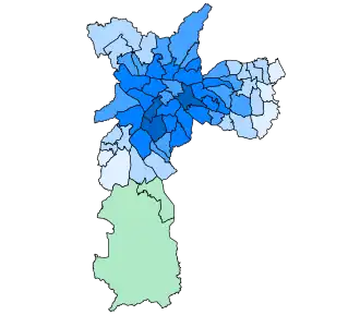The 2016 São Paulo municipal election took place in the city of São Paulo on the 2 October 2016.[2] Voters voted to elect the Mayor, the Vice Mayor and 55 City Councillors for the administration of the city. The result was a 1st round victory for João Doria of the Brazilian Social Democratic Party (PSDB), winning 3,085,187 votes and a share of 53,28% of the popular vote, defeating incumbent mayor Fernando Haddad of the Workers' Party (PT), who took 967,190 votes and a share of 16,70% of the popular vote. Although Haddad came in second place on the popular vote, he did not win any electoral zone, while Marta Suplicy (PMDB), who came in fourth place, managed to win a plurality of the votes in 2 electoral zones.