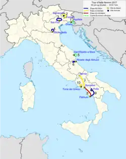 - 5 July 2017 — Roseto degli Abruzzi to Roseto degli Abruzzi, 116.16 km (72.2 mi)[22]