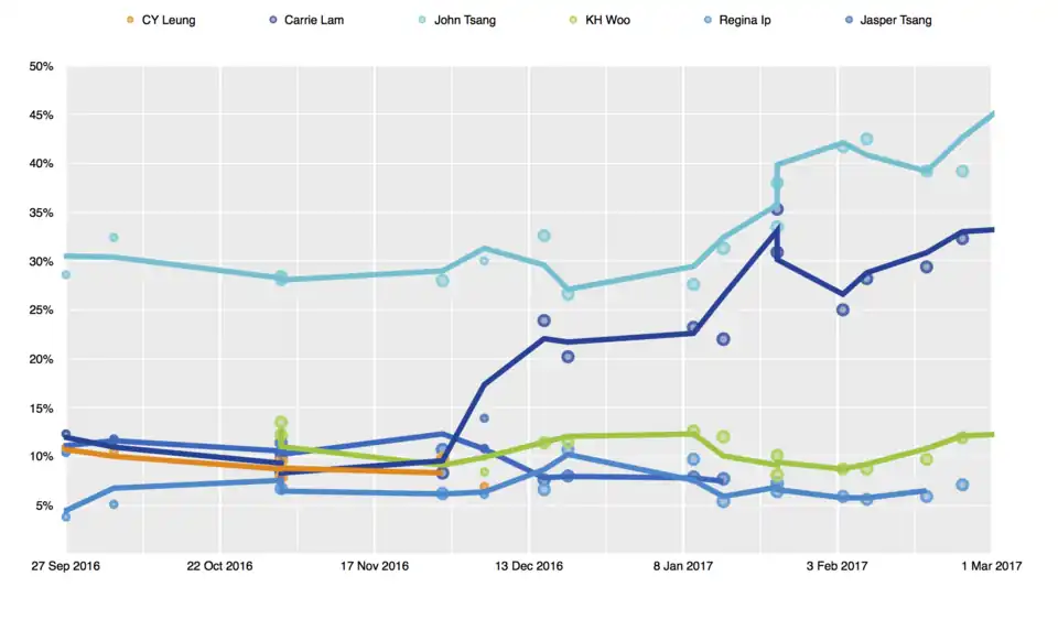 - ^ "John Tsang backed by almost 92 per cent of voters in mock poll for Hong Kong's next leader". South China Morning Post. 19 March 2017.