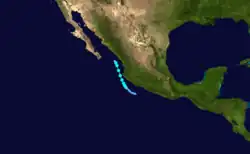 A low-pressure trough began producing disorganized convection over the waters of the Pacific Ocean, well to the south of Baja California Peninsula, on July 14.[54] Despite only marginally conducive environmental conditions, the disturbance began to show signs of organization two days later,[55] and it attained tropical depression status by 06:00 UTC on July 17.[56] Strong west-northwesterly wind shear confined the storm's intermittent bursts of convection well to the southwest of its low-level circulation, and the depression consequently failed to produce winds above 35 mph (55 km/h).[57] The system's center later degenerated into a low-pressure trough within the Intertropical Convergence Zone, prompting the NHC to discontinue advisories at 21:00 UTC on July 20.[58]