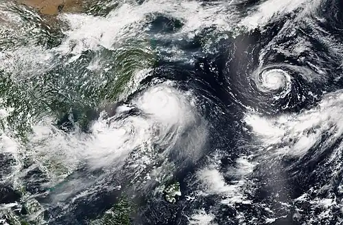 On May 5, Tropical Storm Risk (TSR) issued their first forecast for the season, anticipating an activity of slightly above normal with 27 named storms, 17 typhoons and 10 intense typhoons, including an accumulated cyclone energy (ACE) of 357.[1] On June 26, Taiwan's Central Weather Bureau (CWB) predicted a normal season with 21–25 tropical storms developing over the basin, while three — five systems were expected to affect Taiwan itself.[5] On the same day, the Thai Meteorological Department (TMD) predicted that 2 tropical cyclones would move towards the northern or northeastern parts of Thailand during August or September.[8] On July 6, TSR released their second forecast for the season, reducing the predicted numbers to 25 named storms, 15 typhoons, and 7 intense typhoons, with an ACE Index of 250.[2] During the same day, the PAGASA issued their second and final outlook for the season for the period of July–December, where six to nine tropical cyclones were expected to develop or entered their area of responsibility between July and September, while three to five were forecast during October to December. During August 8, the TSR released their third and final forecast for the season, slightly raising their forecast named storms to 26, with 14 reaching typhoon intensity and 7 reaching intense typhoon intensity. ACE Indices were slightly raised to 255.[3]