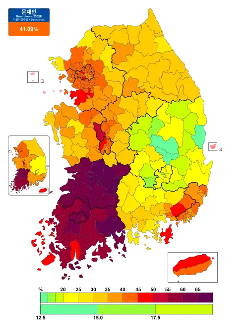 | Region | Moon Jae-in | Hong Joon-pyo | Ahn Cheol-soo | Yoo Seong-min | Sim Sang-jung | |||||