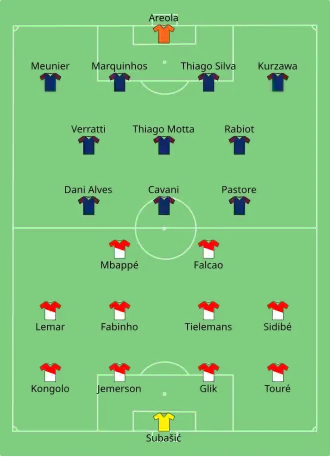Djibril Sidibé opened the scoring for Monaco in the 30th minute when he ran through on goal before clipping the ball past the advancing goalkeeper Alphonse Areola from just outside the penalty area with his right foot. Dani Alves equalised in the 51st minute, scoring with his right foot from a free-kick which went over the wall and into the top left corner from over 25 yards out. Adrien Rabiot got the winning goal in the 63rd minute when he headed into the net from six yards out after a cross from the right from Dani Alves.