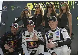 Defending champion Ekström made it two wins from as many starts in the 2017 season, beating Loeb (left) and Kristoffersson
