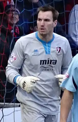 Manager John Askey called for patience as he and new owners Carol and Kevin Shanahan tried to rebuild the club following Norman Smurthwaite's ownership.[2] Though the budget was reduced he aimed to have a smaller and more competitive squad.[3] His first summer signing was midfielder Scott Burgess, released from Bury despite an impressive loan spell at York City; the 21-year-old had previously played on loan at Macclesfield Town in Askey's National League title-winning season.[4] He next signed Adam Crookes, a 21-year-old defender who had been released by Nottingham Forest despite impressing whilst on loan at Vale in the second half of the 2018–19 season.[5] He then signed 25-year-old Kieran Kennedy, "a footballing centre-half" who turned down a new deal at Wrexham in order to return to the English Football League.[6] Big target man striker Richie Bennett then joined, having been let go by Carlisle United.[7] The signings of 27-year-old former Blackpool striker Mark Cullen and 25-year-old former youth team midfielder Ryan Lloyd were confirmed on 26 June.[8] On 8 July, winger David Amoo arrived on a one-year deal after rejecting a new contract with Cambridge United; this was the first signing to meet Askey's priorities of bringing in a winger, a right-back and a backup goalkeeper.[9][10] Askey also evaluated five trialists in pre-season friendlies: 19-year-old Bradford (Park Avenue) midfielder Alex Hurst, former Darlington goalkeeper Jonny Maddison, former Millwall and Reading right-back Shaun Cummings, former Yeovil Town winger Rhys Browne and former Coventry City striker Kwame Thomas.[11] Cummings left without a contract as Askey instead again signed another of his former Macclesfield Town players, 23-year-old Callum Evans, who – like Lloyd – had been released by Macclesfield boss Sol Campbell.[12] Bookmakers predicted a mid-table finish for the club.[13] The club kit was reverted to Erreà manufacturers and the shirt sponsors were revealed as Synectics Solutions, the company owned by chairpersons Carol and Kevin Shanahan.[14] The black and gold away kit was launched in tribute to the protestors who helped to oust Smurthwaite.[15] As pre-season drew to a close the club took a week long trip to Scotland.[16] Trialist winger Rhys Browne, yet another former Macclesfield player, became the ninth summer signing on the day of the club's final pre-season friendly.[17] Signing number ten was the new back-up goalkeeper, 24-year-old Jonny Maddison, who had impressed on trial.[18] A third of the five trialists was also signed. However, Alex Hurst was immediately loaned back to Bradford (Park Avenue) to gain match experience.[19]