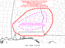 At 9:59 a.m. CST, the SPC issued a mesoscale convective discussion (MCD) giving a 95% chance of a tornado watch being issued for southern Alabama, southwestern Georgia, and northwestern Florida. The SPC noted the potential for a few potentially strong tornadoes in southern Alabama into west-central Georgia. This included the area where this tornado went over. The SPC cited that several radars had strong, curved hodographs with little weakness in them; indicative for this strong tornado potential.[11] Nearly 2 hours later, the SPC issued a tornado watch for Southern Alabama into Northwest Florida.[12] Less than an hour later, the SPC also issued a tornado watch for a large portion of central Georgia, and a small part of the central Florida Panhandle.[13] Both of these watches cited that "A few tornadoes likely with a couple intense tornadoes possible", and had an 70% chance of 2 or more tornadoes, and a 50% chance of 1 or more significant (EF2 or higher) tornadoes.[12][13] A squall line of storms continued to develop along the cold front, with semi-discrete supercells embedded within the line. A few discrete supercells were also noted on radar imagery in southern Georgia, and another developing supercell over Alabama that would later produce this tornado.[7] Significant tornado parameters[note 2] increased along the line where the embedded discrete supercell was located was consistently at a 3 to a 4. In addition, a local increase of storm relative helicity to 600 also aided in the development in the strong tornado. All of these parameters in place increased the tornado potential in this area, as noted by an MCD that was issued for a small area exactly 1 hour before the tornado touched down. The SPC noted that the shear and CAPE were maximized, and that strong tornadogenesis will likely occur "within the next 30-60 minutes".[7][14]