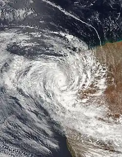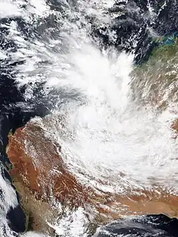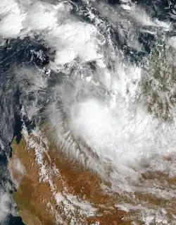 As the tropical low tracked southeastwards towards the coast, environmental conditions continued to improve, with sea surface temperatures nearing 31 °C (88 °F) and the system maintaining a robust poleward outflow channel in the upper troposphere.[53] As the system strengthened in the moderately favourable environment, the BOM estimated the minimum atmospheric pressure at the centre of the low to be 997 hPa (29.44 inHg) at 18:00 UTC on 8 December.[54] The JTWC issued a Tropical Cyclone Formation Alert for the tropical low at 21:30 UTC, noting the presence of convective rainbands wrapping into the system, as well as persistent deep convection over the low-level circulation centre. By this time, however, the system was quickly approaching the Australian coast, so the time available for further intensification was very limited.[53] The tropical low made landfall on the Kimberley coast between Bidyadanga and the Anna Plains cattle station just after 00:00 UTC on 9 December.[55] The system moved inland over the following days, tracking in a generally south-southeasterly direction. The system was last mentioned as a tropical low by the BOM on 11 December while located in central Western Australia.[56][57]