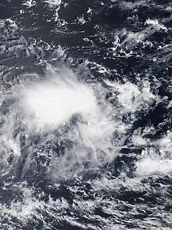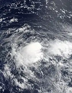 On 5 January, the Bureau of Meteorology (BOM) reported that a weak tropical low had formed within a trough over the eastern Indian Ocean, centred approximately 500 km (310 mi) northeast of the Cocos Islands.[115][116] Environmental conditions were assessed by the BOM as being unfavourable for significant intensification of the low, citing in particular the strong easterly winds in the upper troposphere that were forecast to develop by 10 January.[117] The tropical low meandered gradually southwards over the following days,[118] passing well to the east of the Cocos Islands on 8–9 January, around which time the system began to accelerate towards the west-southwest.[117][119] On 9 January, the Joint Typhoon Warning Center (JTWC) reported the development of formative convective rainbands wrapping into the tropical low's centre, and determined that environmental conditions were favourable for the system to strengthen, in contrast with the BOM's assessment. The JTWC noted the presence of strong poleward upper-level outflow, low vertical wind shear values and warm sea surface temperatures of 29–30 °C (84–86 °F).[120] By 05:00 UTC on 10 January, gale-force winds had developed in the southern quadrants of the tropical low, in part due to the fast translational velocity of the system towards the west-southwest.[119] The system's minimum atmospheric pressure was estimated at 1002 hPa (29.59 inHg) at that time.[121] Then, the system exited the basin towards the Southwest Indian Ocean on 10 January, before dissipating immediately thereafter, due to unfavourable high wind shear.