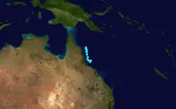 On 12 January, the Bureau of Meteorology noted that a monsoonal trough could develop within a week, that would make conditions in the Australian Region basin favorable for tropical cyclogenesis.[127] On 16 January, a weak tropical low formed to the northeast of Queensland.[128] Later that day, the Joint Typhoon Warning Center (JTWC) issued a Tropical Cyclone Formation Alert on the system.[129] At 02:10 UTC on 17 January, the Bureau of Meteorology upgraded the tropical low into Tropical Cyclone Kimi, while located northeast of Cooktown.[130] A small tropical cyclone, Kimi moved slowly southward while remaining offshore of the Australian coastline.[131] Late on 17 January, radar imagery from Cairns developed low-level convective rainbands, which wrapped into the storm's center of circulation.[132] Around this time, Kimi grew large bursts of deep convection, with a well-defined circulation visible on satellite imagery.[133] However organization began to slow on 18 January, with convection becoming displaced to the west of the center.[134] Radar from Townsville and satellite imagery showed that some unexpected wind shear had caused convection to now become displaced to the southeast of the center as the deep convection began to weaken from the wind shear. The wind shear also caused Kimi began to move away from the coast of Australia.[135] Late on 18 January, Tropical Cyclone Kimi weakened into a tropical low while moving slowly away from the North Queensland coast.[136]