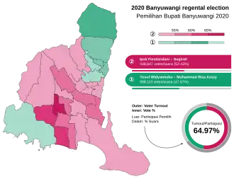 The 2020 Banyuwangi regental election was held on 9 December 2020 to elect both the regent and vice-regent of Banyuwangi Regency as part of local elections across Indonesia. The incumbent regent, Abdullah Azwar Anas, was term-limited.[1] The pair of Ipuk Fiestiandani and Sugirah were elected regent and vice-regent respectively.[2] The election was noted for the rise of a political dynasty, as Ipuk was the wife of the incumbent regent.[3]