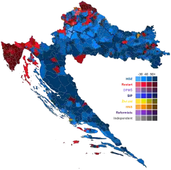 1. ^ Of the 66 seats won by the HDZ-led alliance, the HDZ won 62, the Croatian Social Liberal Party won two and the Croatian Christian Democratic Party and Croatian Democratic Alliance of Slavonia and Baranja won one each.