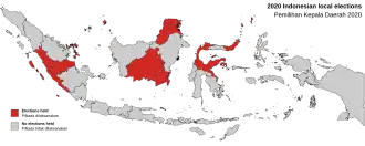 Simultaneous local elections (Pilkada Serentak) were first held in Indonesia in 2015.[2] The leadup to the 2020 elections saw several regulations being issued by the General Elections Commission (KPU) barring certain candidates from running, from adulterers[3] to politicians who had been charged with corruption.[4] The decision that the simultaneous local elections throughout Indonesia would be held amid the COVID-19 pandemic stirred some controversy in the Indonesian public.[5][6]