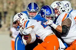 Air Force's George Silvanic holds back Boise State's George Holani and Kekaniokoa Holomalia-Gonzalez on Oct. 31, 2020, in Falcon Stadium at the U.S. Air Force Academy.