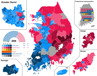 The Democratic Party won 163 constituency seats, while their satellite Platform party won 17 proportional representation seats, giving the alliance a total of 180 seats in the 300-seat assembly, enough to reach the three-fifths super-majority required to fast-track assembly procedures and "do everything but revising the Constitution at the parliament."[31] This was the largest majority for any party since democracy was restored in 1987.[26] The United Future Party and their satellite Future Korea Party won 84 constituency and 19 proportional seats respectively; their total of 103 seats (34.3%) was the worst conservative result since the 1960 legislative elections. Commentaries have reported this result as a realigning election for South Korea.[32][33]