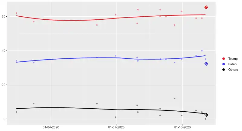 | FiveThirtyEight[32] | until November 2, 2020 | November 3, 2020 | 36.2% | 59.2% | 4.6% | Trump +23.0 |