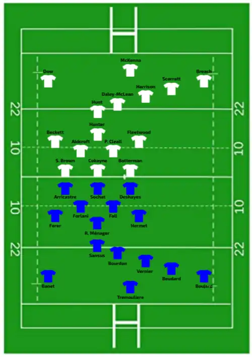 | 12:00 GMT (UTC±00:00) | Report | Try: Banet (2) 3' m, 37' c Sansus (2) 30' c, 51' m N'Diaye 47' c M. Ménager 63' c Annery 67' m Boudard 76' c Con: Trémoulière (5/8) 31', 39', 48', 64', 78' |