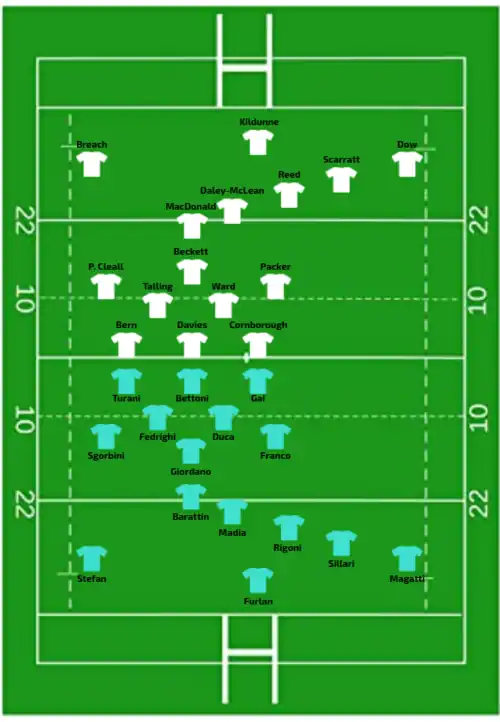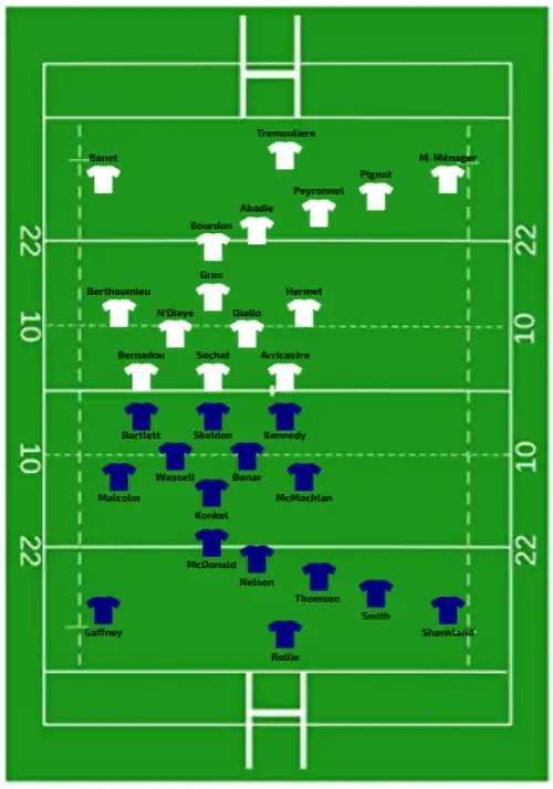 | 21:00 CET (UTC+01:00) | Try: Forlani 5' c Banet (2) 17' c, 32' c Annery 44' c Penalty try 78' Sansus 80' +1 c Con: Trémoulière (4/4) 6', 18', 33', 45' Bourdon (1/1) 80' +2 Pen: Trémoulière (1/1) 12' |