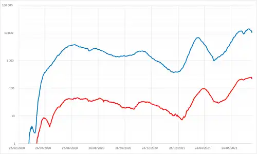 Medical experts feared that not enough tests were being conducted.[8][9] Newspaper reports and social media continued to report about additional deaths of patients with COVID-19 symptoms. Some of the deceased were treated at COVID-19 isolation centres at hospitals in the districts and others were denied treatment, though no tests were conducted to confirm contagion.[10] For a long time, testing was centralised to only Institute of Epidemiology, Disease Control and Research (IEDCR) in the capital Dhaka, although patients with symptoms were reported all around the country.[11] On 22 March, Bangladesh declared a 10-day shut down effective from 26 March to 4 April.[12] This was later extended to 30 May.[13] Besides, Medical-grade Oxygen has been a concern to look at as the present demand for Oxygen in Bangladesh is around 200 tonnes in a day for medical treatment purposes, which has a significant possibility to elevate at an exponential rate everyday, hence, to meet up the potential needs, Bangladesh is required to ready itself, by establishing a demand forecasting model for Medical-grade Oxygen at the earliest with the coordinated efforts of Department of Public Health Engineering (DPHE); and Institute of Epidemiology, Disease Control and Research (IEDCR).[14]