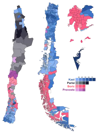 In the subsequent presidential election, candidates from the traditional centrist coalitions finished in fourth and fifth place, while two candidates from newly formed parties and coalitions, Kast and Boric, qualified for the second round.[9] This represented a departure from the country's political history, which had repeatedly seen power bounce between center-right and center-left parties with little structural movement between presidents.