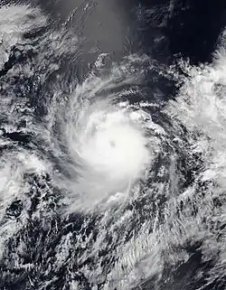 A tropical wave moved off the coast of Africa on July 6 and emerged into the eastern Pacific basin a week later, where the background environment already favored cyclonic spin. Consequently, a disturbance spawned along the wave axis developed into a tropical depression by 00:00 UTC on July 17 and further into Tropical Storm Guillermo within twelve hours. A potent ridge pushed the cyclone west-northwest, while a favorable combination of low wind shear and very warm ocean temperatures allowed it to intensify. Guillermo reached peak winds of 60 mph (97 km/h) on July 18 despite a slightly less organized satellite appearance. Around this time, the storm produced tropical storm-force gusts on Socorro and Clarion islands. After its peak, Guillermo encountered cooler waters and higher wind shear, which ultimately caused it to degenerate to a remnant low by 00:00 UTC on July 20. The low moved faster to the west-southwest before it was absorbed by a trough a day later far away from land.[35]