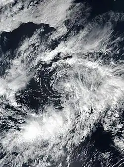 A tropical wave entered the eastern Pacific on August 1, and the resultant disturbance organized into a tropical depression around 12:00 UTC on August 7. The newly formed cyclone swiftly intensified amid very high mid-level moisture and ocean temperatures, becoming Tropical Storm Kevin six hours later and reaching peak winds of 65 mph (105 km/h) on August 8. Wind shear abruptly increased later that day, confining the storm's convection into the western semicircle. Kevin passed near Clarion Island on August 10 as it moved west then west-northwest, producing tropical storm-force gusts there. By 12:00 UTC on August 12, all associated convection dissipated, and the system degenerated to a remnant low. The low curved northwest and dissipated west of Baja California Sur on August 15.[61]