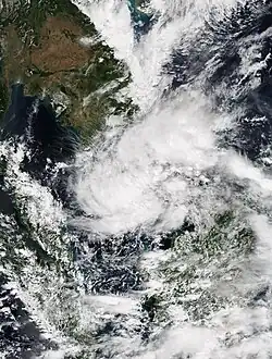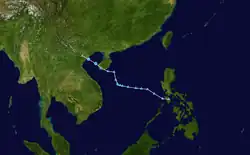On June 10, the JTWC started to monitor an area of low-pressure in the South China Sea, approximately 518 km (322 mi) to the south of Hong Kong, with the agency classifying the system as a monsoon depression.[85] Tracking west-northwestward, the storm was located in a favorable environment for further development, with warm sea surface temperatures and low wind shear.[86] At 00:00 UTC on June 11, the JMA upgraded the system into a tropical depression.[87] Six hours later, the JTWC issued a TCFA for the system as it began to show characteristics of a monsoon depression.[88] By 18:00 UTC, the JMA upgraded the system to a tropical storm, assigning it the name Koguma.[87] On June 12 at 00:00 UTC, the JTWC upgraded Koguma to a tropical depression, assigning it the designation 05W.[89] Later that day, the JTWC also upgraded Koguma to a tropical storm.[89] By June 12, it had made landfall southeast of Hanoi,[90] and dissipated the next day.[87]