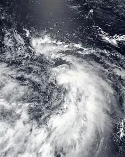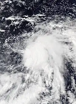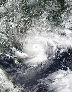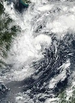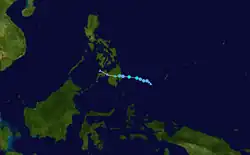 On May 11, the JTWC noted a persistent area of convection in the Philippine Sea, approximately 184 nmi (341 km) west of Palau.[41] The JTWC issued a TCFA for the convection on May 12, as it further developed in an environment with low vertical wind shear and warm sea surface temperatures.[42] Just three hours later, the agency recognized that the area of convection had quickly consolidated into a tropical depression and assigned it with the identifier of 03W.[43] Around the same time, the JMA had also recognized the storm as a tropical depression while it was to the east of Mindanao.[44] Since the storm developed within the Philippine Area of Responsibility, the PAGASA immediately named the storm Crising once the agency recognized it as a tropical depression as well, and later raised Signal No. 2 warnings for areas in Mindanao.[45][46] In the early hours of May 13, the JTWC upgraded the system into a tropical storm, with the PAGASA following suit hours later.[47][48] Later that day, Crising's low-level circulation center became exposed due to wind shear, and it lost organization. At 8:20 p.m. Philippine Standard Time (12:20 UTC), Crising made landfall in Baganga, Davao Oriental as a weakening tropical storm. It quickly degraded as soon as it made landfall, with both the JTWC and the PAGASA downgrading it to a tropical depression at 15:00 UTC.[49][50] At 03:00 UTC on that day, the PAGASA reported that the system degenerated to an area of low-pressure in the vicinity of Piagapo in Lanao del Sur, thus lifting all warning signals on Mindanao and issuing their final advisory.[51] On May 14, the system dissipated over the Sulu Sea, and both the JMA and the JTWC issued their final advisories on the storm.