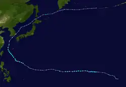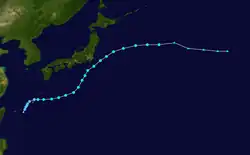 On May 27, the JMA and the JTWC noted the persistence of an area of atmospheric convection about 425 nautical miles (787 km; 489 mi) south-southeast of Guam.[57] The area's nearby environment exhibited low wind shear and warm sea surface temperatures, which were ideal conditions for tropical cyclogenesis.[58] The JMA assessed the area to have developed into a tropical depression on May 29 at 06:00 UTC.[59] The PAGASA made a similar assessment in a Tropical Cyclone Advisory issued at 15:00 UTC.[60] The JTWC later followed with their own assessment, identifying the center of the newly developed tropical depression and assigning the designation 04W.[61] As the system tracked westward, it entered the Philippine Area of Responsibility at 01:00 PHT (17:00 UTC).[62] The PAGASA then named the storm Dante in its first Tropical Cyclone Bulletin for the storm.[63] Dante further organized in the Philippine Sea,[64] and on May 30 at 15:00 UTC, the JTWC upgraded it to a tropical storm,[65] with the PAGASA doing the same at 21:00 UTC.[66] On the next day at 00:00 UTC, the JMA also upgraded Dante into a tropical storm, giving it the international name Choi-wan.[67] Choi-wan's center was exposed due to a tropical upper tropospheric trough from the northeast, inducing shear on the system.[68] On June 1 at 12:30 UTC, Choi-wan made landfall on Sulat, Eastern Samar as a minimal tropical storm,[69] with the JTWC downgrading it to a tropical depression at 15:00 UTC.[70] It made a second landfall on Cataingan at 17:00 UTC.[71] Choi-wan made several more landfalls on the Philippines, making its third landfall on Balud, Masbate at 19:30 UTC. It made a fourth landfall on Romblon, Romblon on June 2 at 00:00 UTC, a fifth on San Agustin, Romblon at 00:50 UTC, a sixth on Pola, Oriental Mindoro at 06:00 UTC, a seventh on Tingloy, Batangas at 11:20 UTC, and an eighth and final landfall on the Calatagan Peninsula before moving into the South China Sea.[72] On June 3 at 03:00 UTC, the JTWC upgraded Choi-wan back to a tropical storm.[73] At 03:00 UTC, the PAGASA removed all Tropical Cyclone Warning Signals as Choi-wan moved away from the country.[74] Choi-wan then exited the PAR on June 3 at 18:00 UTC[75] before weakening into a tropical depression on the next day at 06:00 UTC and re-entering the PAR at 08:00 UTC.[76] Then, it passed southeast of the island of Taiwan[77] before moving out near the Okinawa Prefecture and heading towards Japan. On June 5 at 06:00 UTC, the Japan Meteorological Agency issued their final advisory on the system.[78] 3 hours later at 09:00 UTC, the JTWC upgraded Choi-wan back into a tropical storm,[79] however at 15:00 UTC, the Joint Typhoon Warning Center downgraded the system to a tropical depression, also issuing their final advisory on the system.[80]