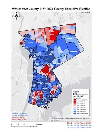 The 2021 Westchester County Executive election was held on November 2, 2021. The election was between incumbent county executive George Latimer and former advisor to former county executive Rob Astorino Christine Sculti. The elections were held on the same day as elections for Westchester County Board of Legislators. Latimer defeated Sculti by a comfortable margin.[1][2]