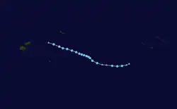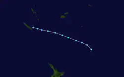 On February 22, the FMS reported that a low-pressure system was located just south of Samoa, and gave it a low chance of formation into a tropical cyclone in the next 5 days.[76] Under a moderate sheared environment and warm sea surface temperatures, the system organized into a tropical disturbance late on the next day, with the FMS designating it as 08F.[77] The disturbance steered southwest from a subtropical ridge on February 26 after upgrading to a tropical depression.[78] During February 26, the JTWC issued a Tropical Cyclone Formation Alert (TCFA) on the system.[79] The system was upgraded to a Category 1 tropical cyclone and attained the name Judy from the FMS after improved organization the same day.[80] The JTWC also upgraded the system to Tropical Cyclone on February 27, initiating advisories on it as Tropical Cyclone 15P.[81] Judy further developed due to high sea surface temperatures of 30 °C (86 °F), leading to the FMS to upgrade its status to Category 2 tropical cyclone the same day,[82] before upgrading further to a Category 3 severe tropical cyclone on February 28.[83] Judy eventually became a Category 4 on the Australian scale and Category 3 on the SSHWS.[84][85] The system began to weaken as it headed southeastward, entering the area of responsibility of the MetService.[86] The JTWC issued their last warning on the system on March 3 as it transitioned to a subtropical cyclone.[87] At the same time, the MetService had downgraded the system to Category 2 tropical cyclone status.[88] It later became an extratropical cyclone by the next day.[89]