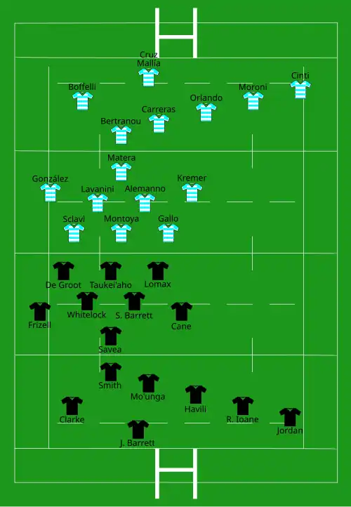 | Try: Taukei'aho 11' m Clarke 32' c Con: Mo'unga (1/2) 33' Pen: Mo'unga (2/3) 28', 46' J. Barrett (0/1) | Report | Try: González 47' c Con: Boffelli (1/1) 48' Pen: Boffelli (6/6) 7', 17', 36', 40', 56', 65' |