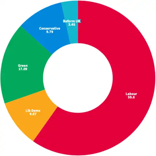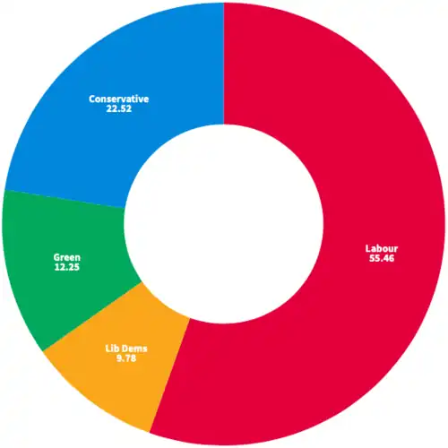 Since its formation, Southwark has been continuously under Labour control, apart from a period of no overall control from 2002 to 2010. Apart from an independent in 1982 and a Green Party councillor in 2006, all councillors have been from the Labour Party, Liberal Democrats or the Conservative Party. Labour regained its majority in the 2010 election, winning 35 seats with the Liberal Democrats on 25 and the Conservatives on three. Labour extended its majority by winning 48 seats in the 2014 election with the Liberal Democrats on 13 seats and the Conservatives on two. The Conservatives lost all their representation in the most recent election in 2018, with Labour winning 49 seats with 53.09% of the vote across the borough and the Liberal Democrats winning the remaining 14 seats with 21.36% of the vote. The Green Party received 12.04% of the vote and the Conservatives received 10.46% of the vote but neither party won any seats.[2] The incumbent council leader, Peter John, was reappointed following the election.[3]